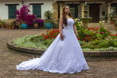 Con este hermoso vestido princesa con drapeado y brillo sutil lograrás atraer todas las miradas y crear recordación. Puedes usarlo con o sin capa, tendencia 2020.