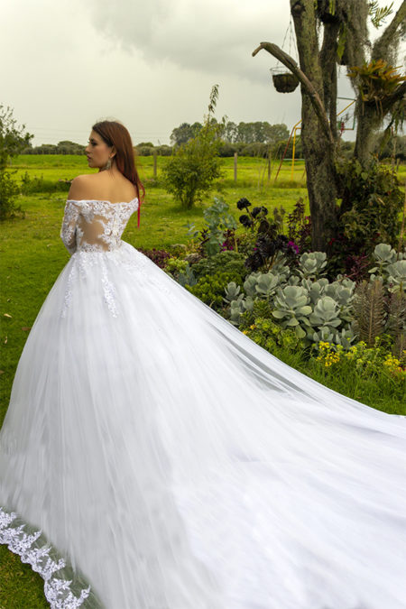 Con su romántico encaje, pedrería sutil, tul cristal para dar efecto tatto en mangas y espalda y cola monarca lograrás atraer todas las miradas.
